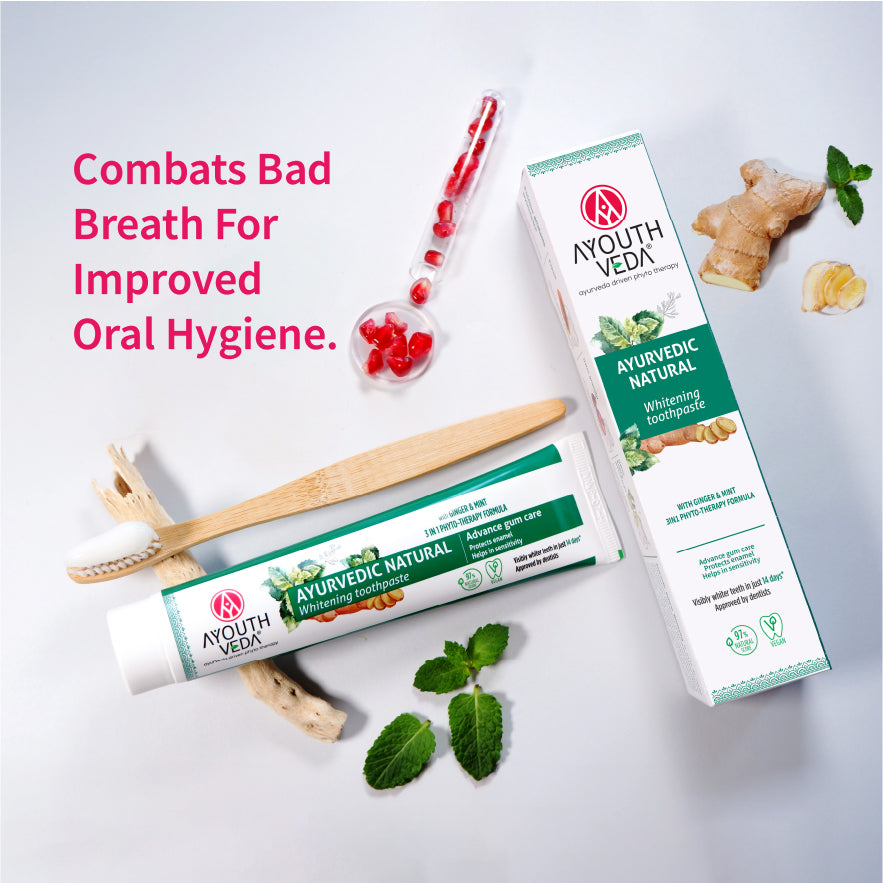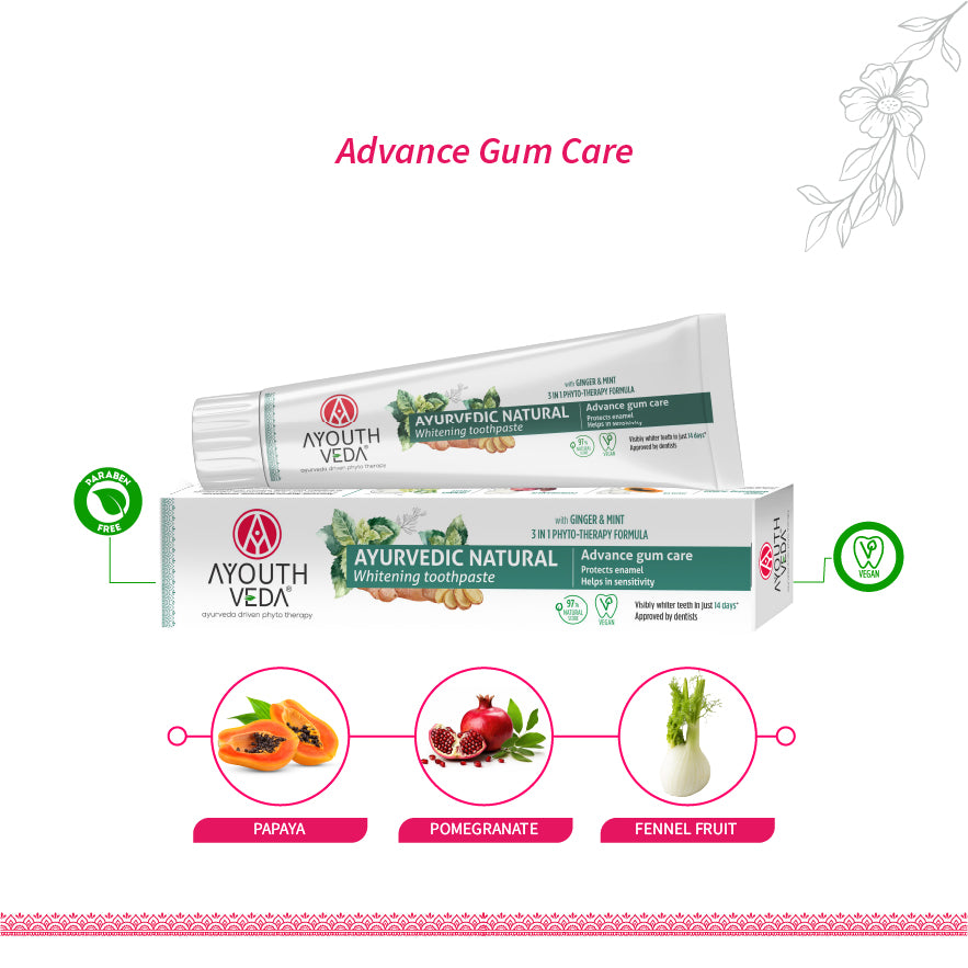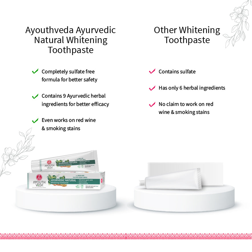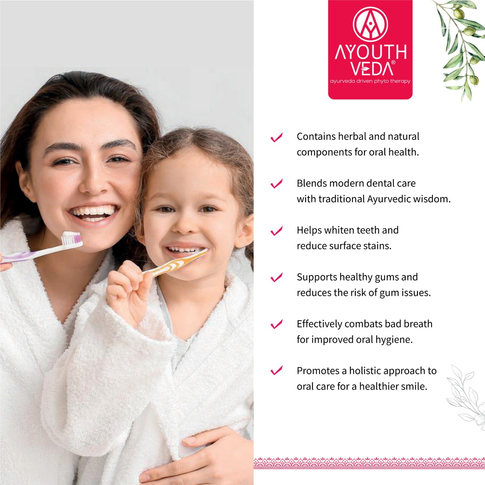 AYOUTHVEDA Ayurvedic Natural Whitening Toothpaste features advanced whitening technology and natural ingredients to effectively remove plaque, prevent new stains, and offer relief from sensitivity.