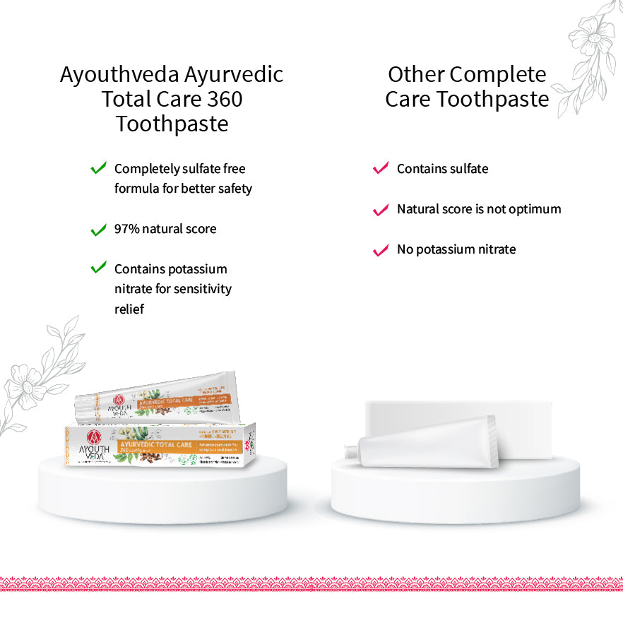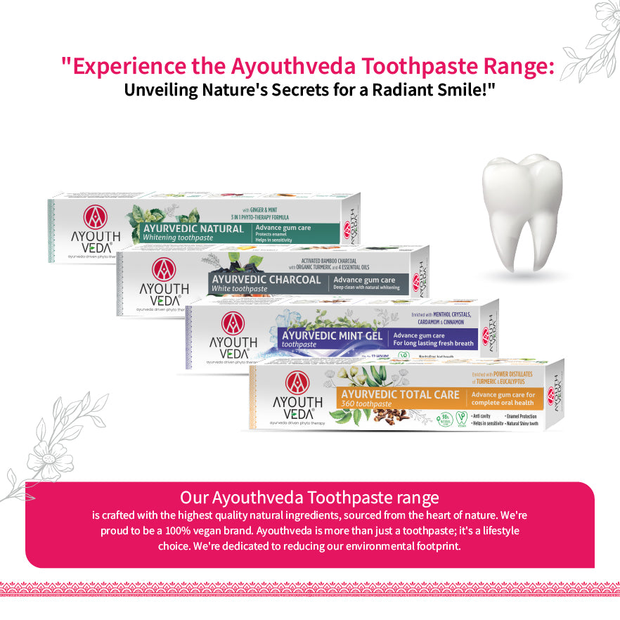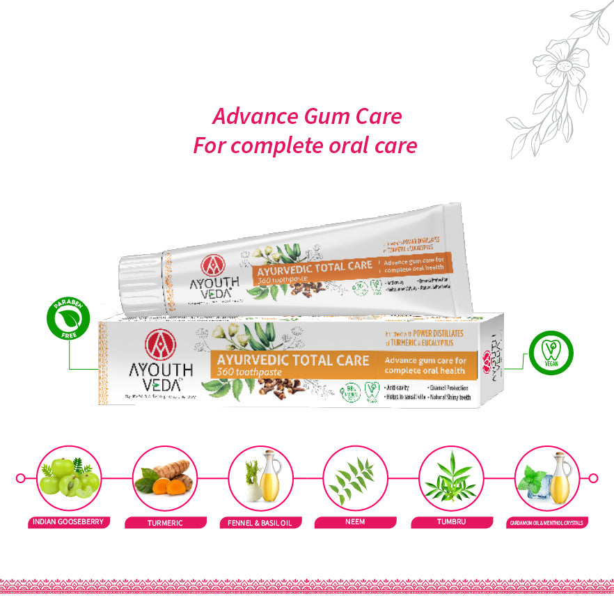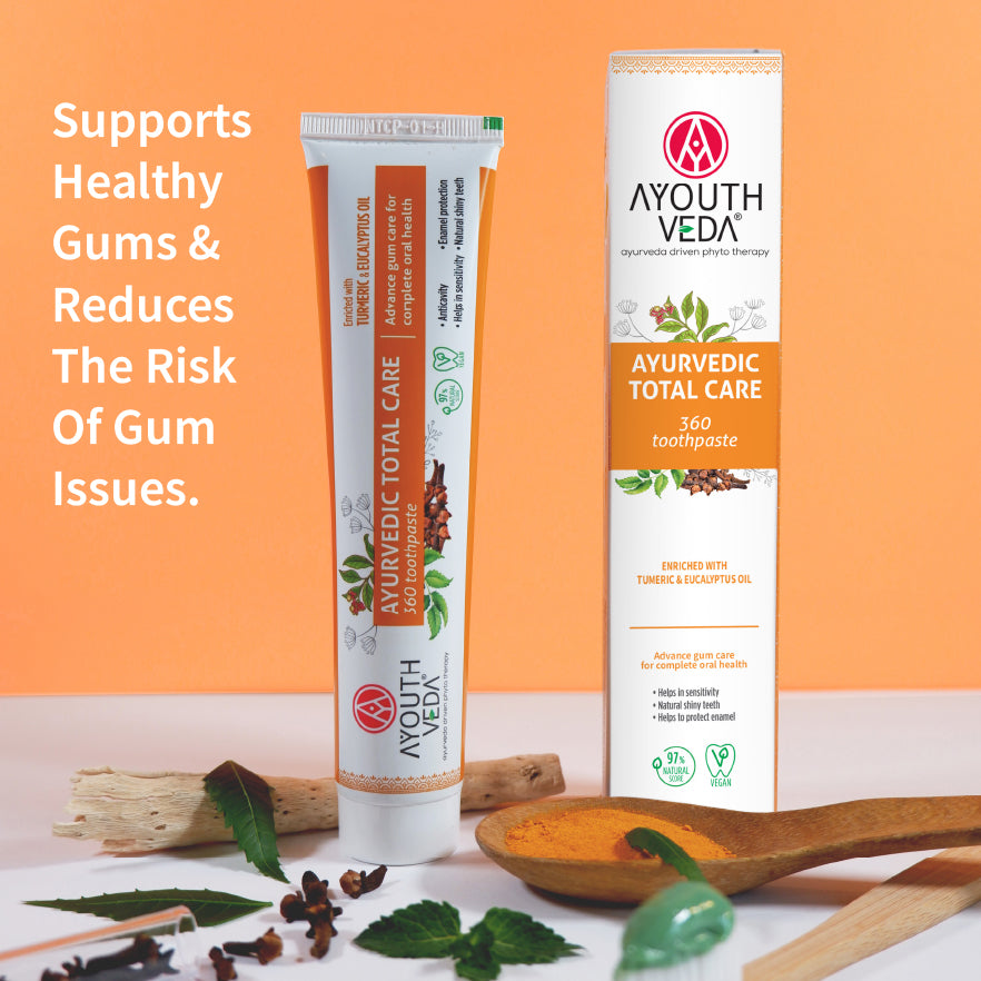 AYOUTHVEDA Ayurvedic Complete Oral Care 360 Toothpaste is infused with carefully selected herbs to promote comprehensive dental wellness, offering a range of benefits to safeguard your teeth, enamel, and gums.