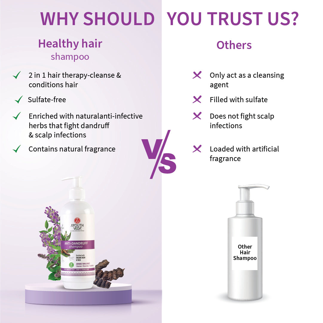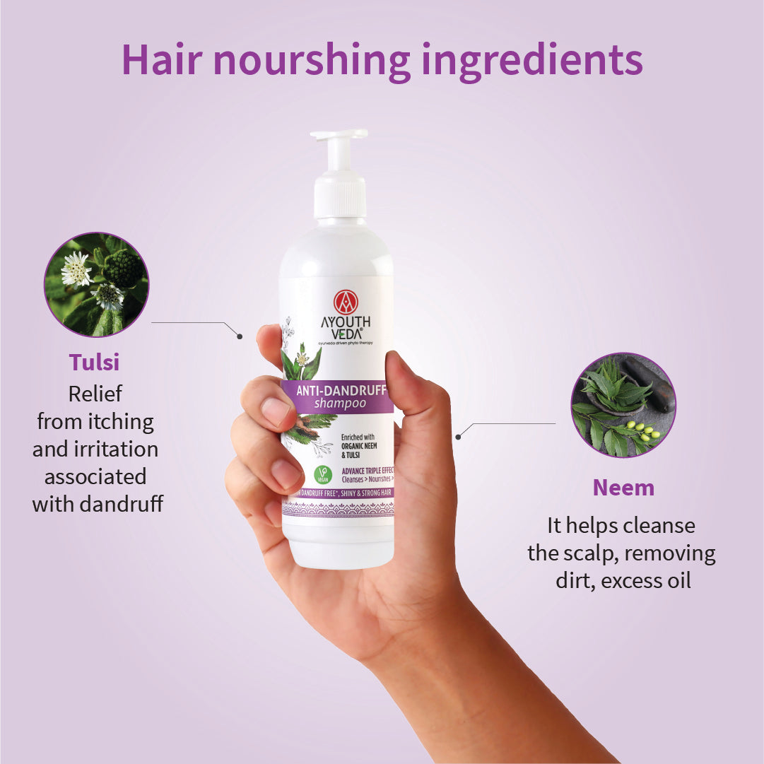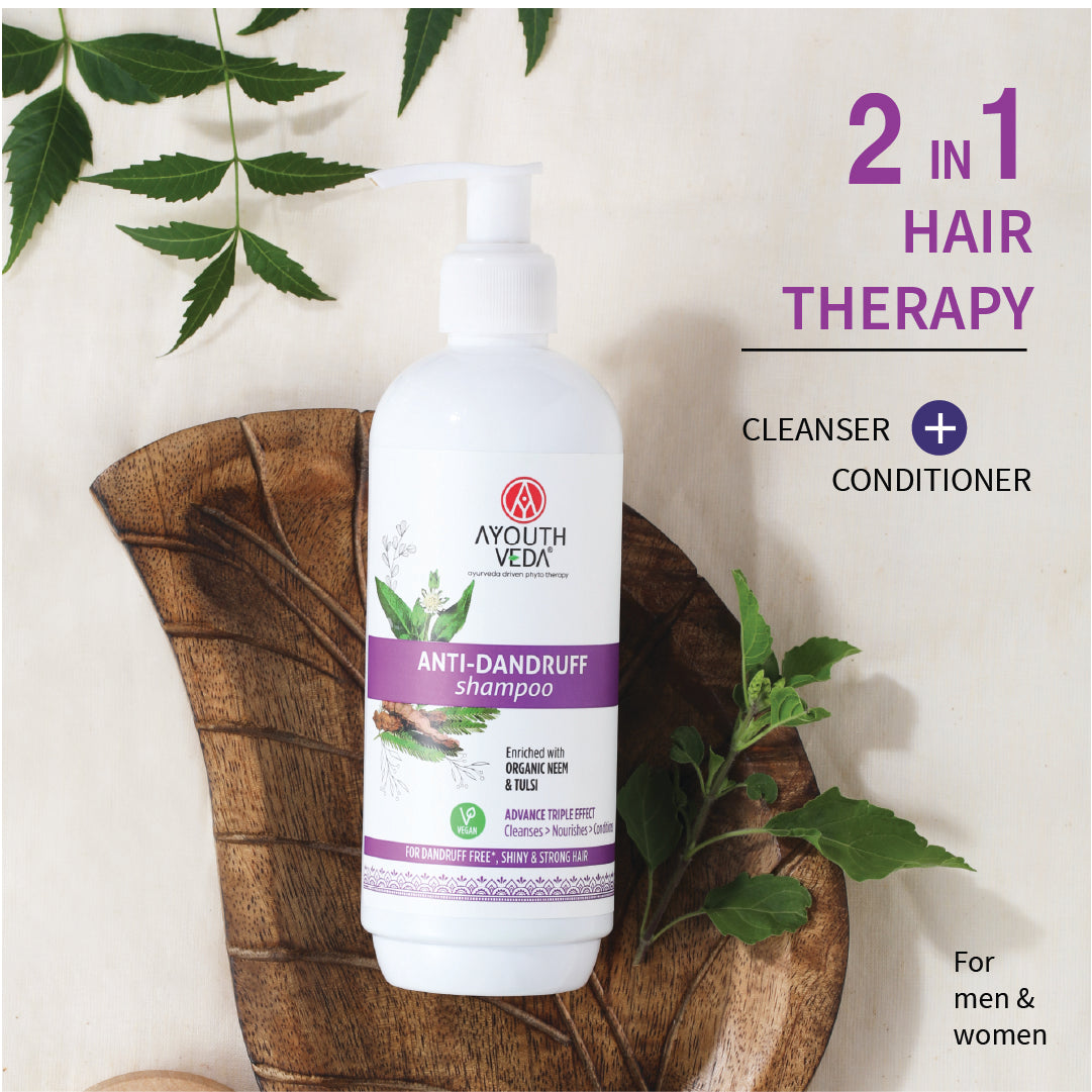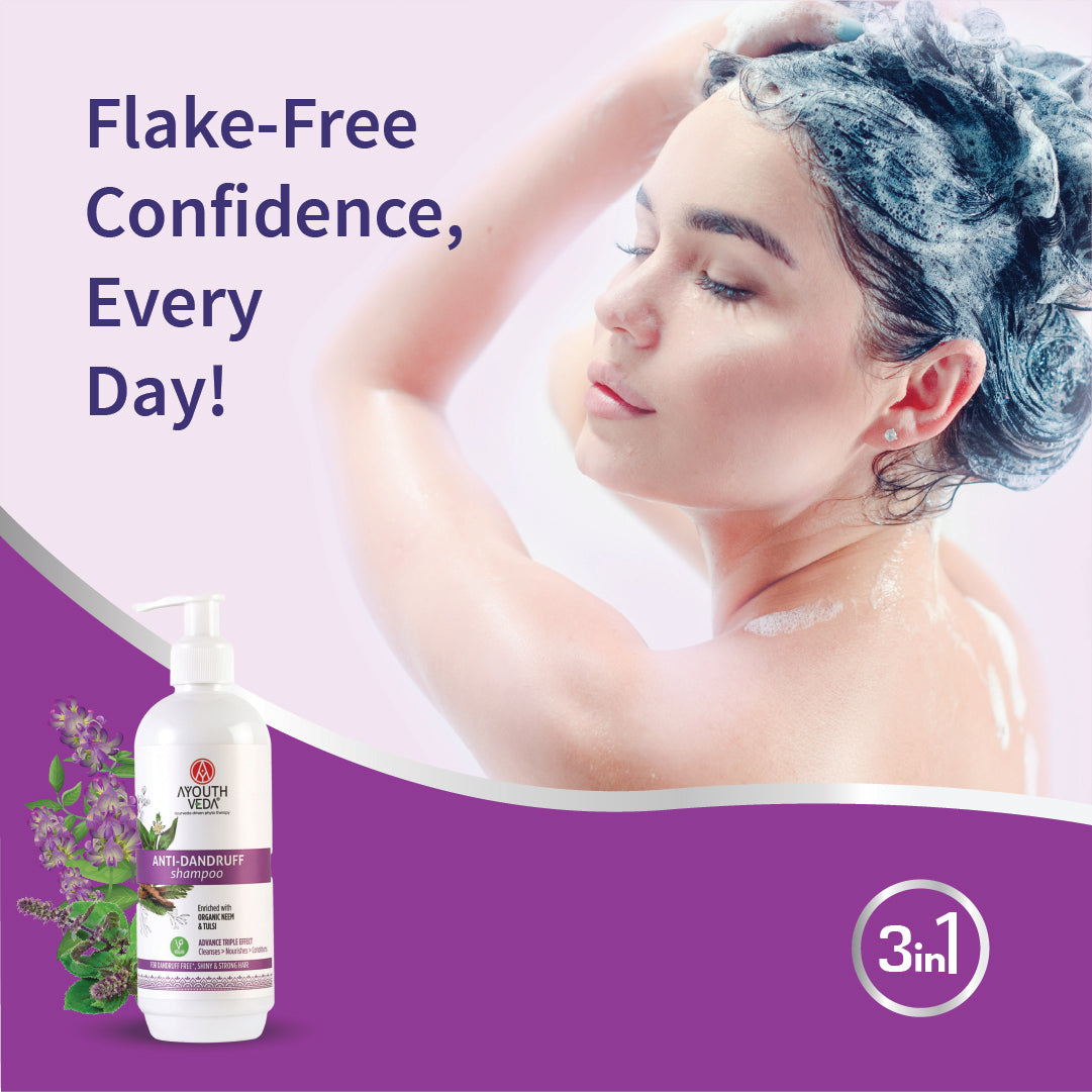AYOUTHVEDA Anti-Dandruff Shampoo harnesses the power of a unique blend of authentic herbs to combat dandruff. Infused with the synergistic action of Neem and Tulsi, it effectively fights dandruff-causing germs, promoting a healthy scalp and nourished hair.