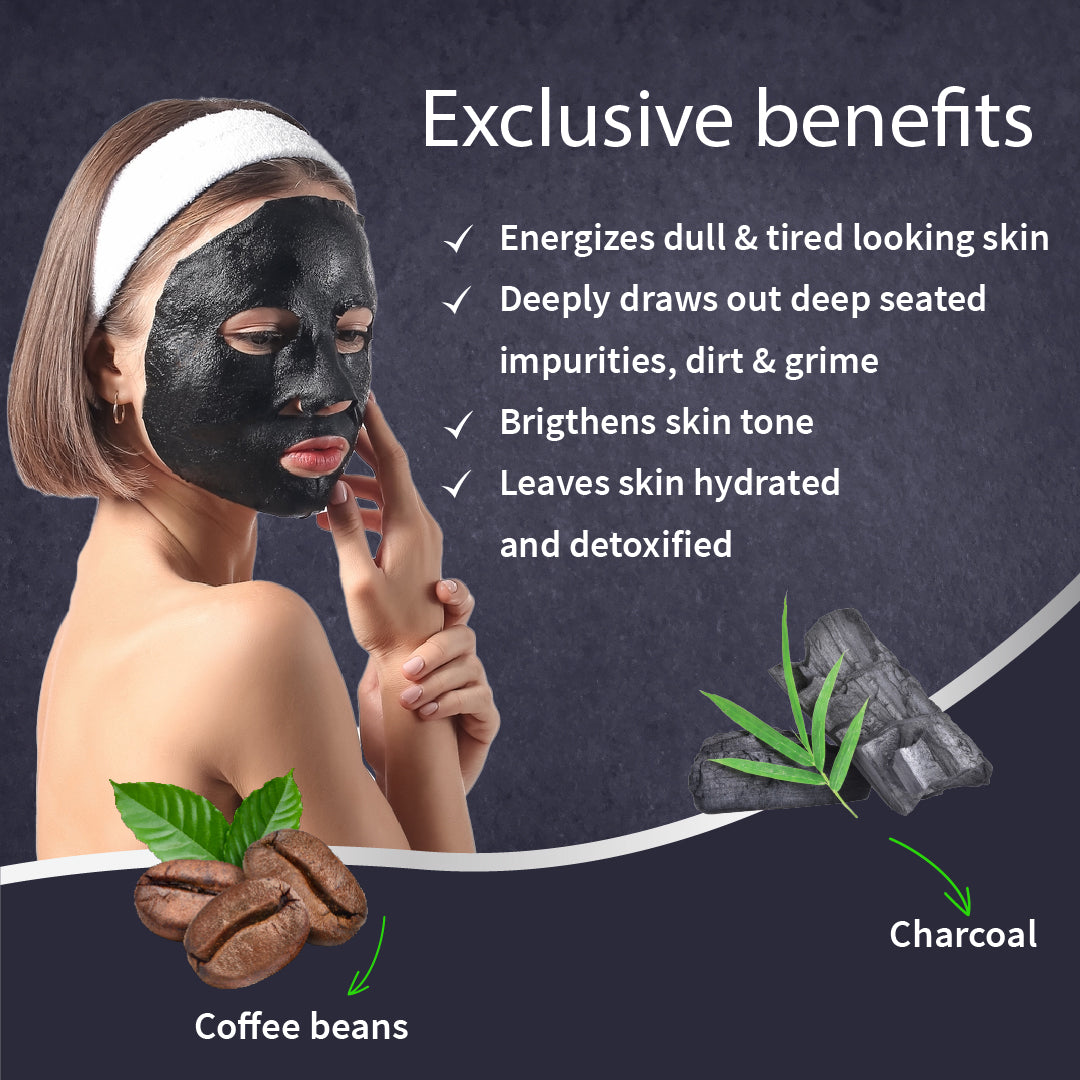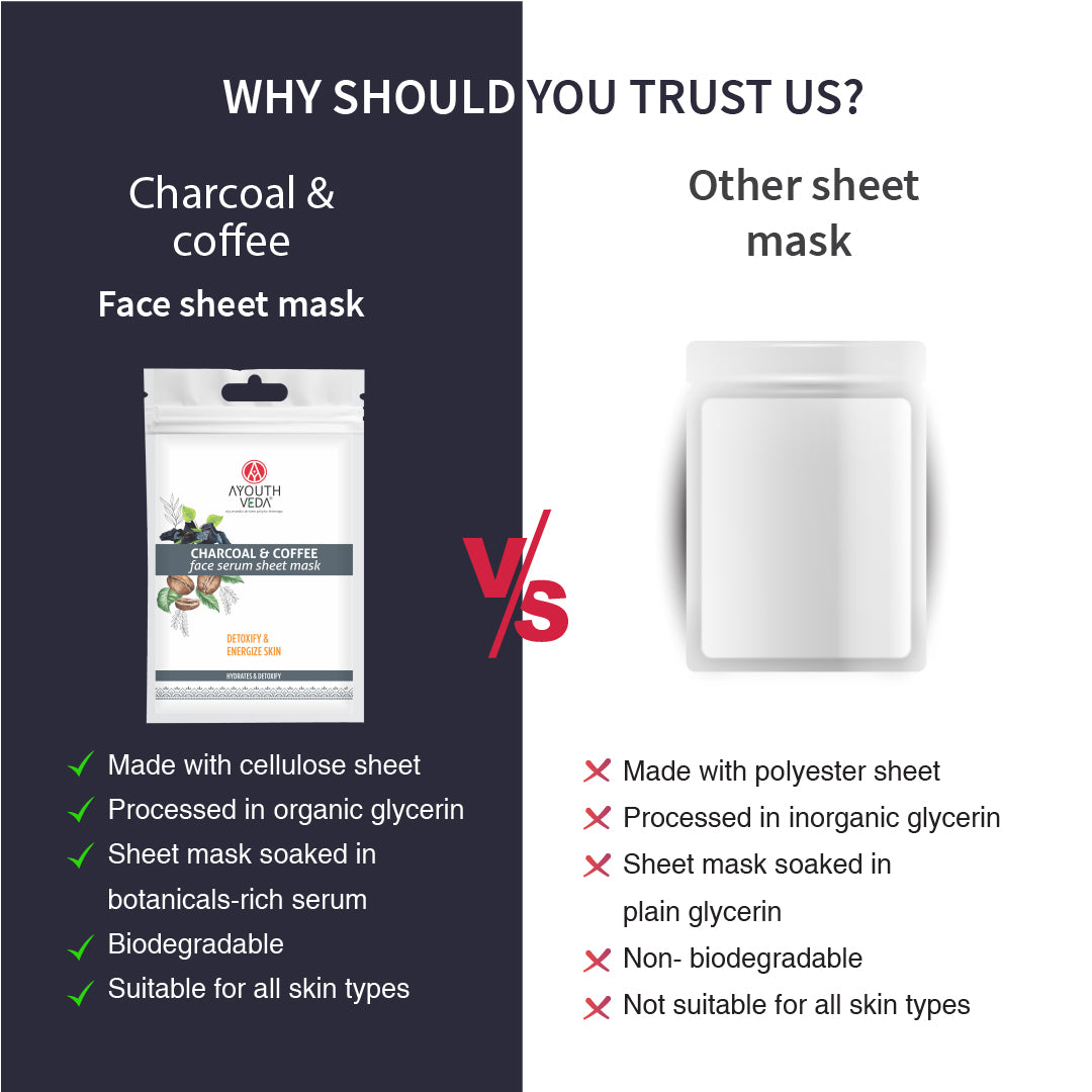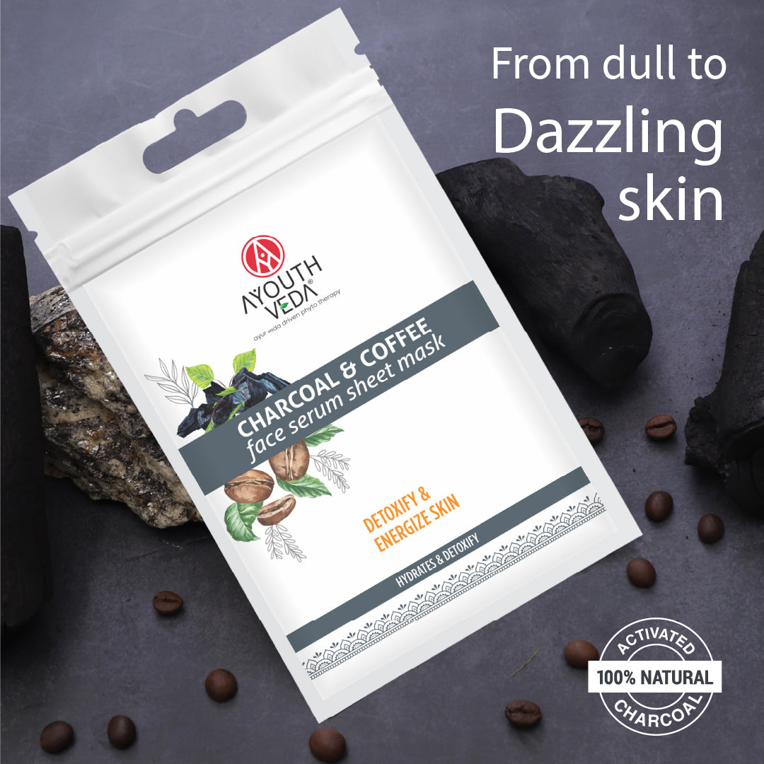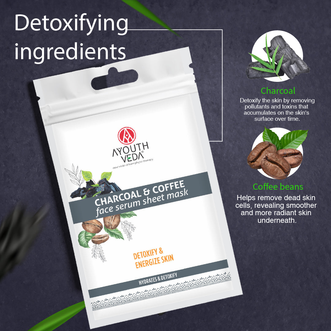 AYOUTHVEDA Charcoal & Coffee Face Serum Sheet Mask, a professional-grade formula that combines the benefits of skin purification and hydration. This innovative mask deeply absorbs impurities like dirt, pollution, and excess oil, leaving your skin dewy, firm, and nourished.