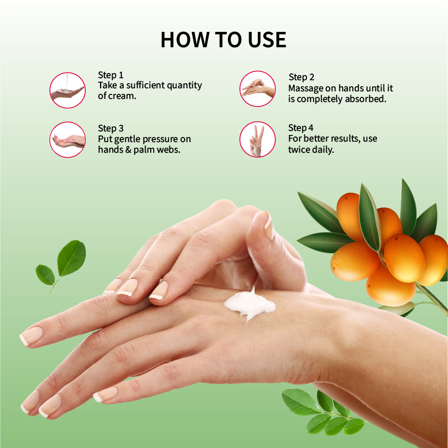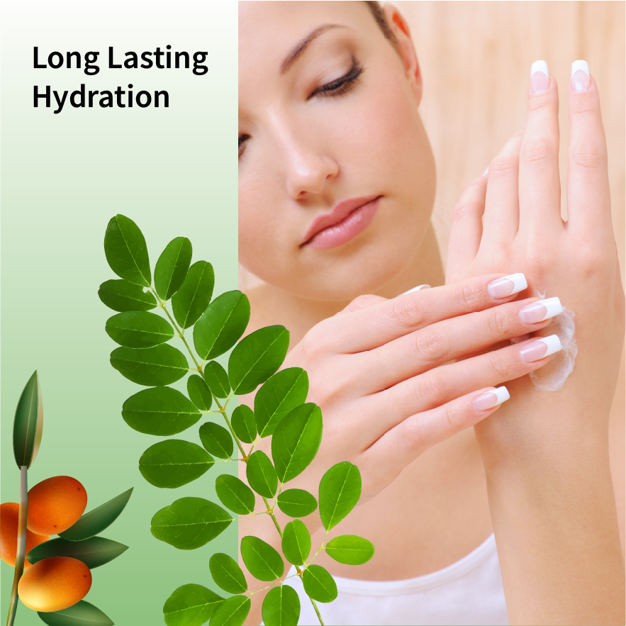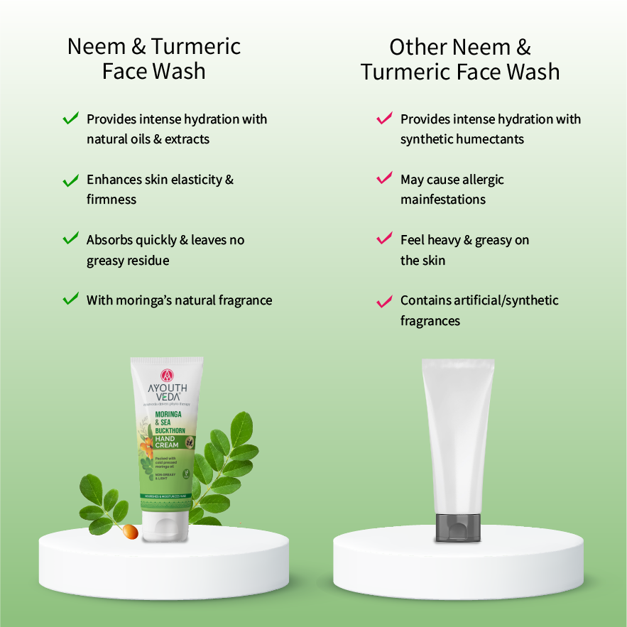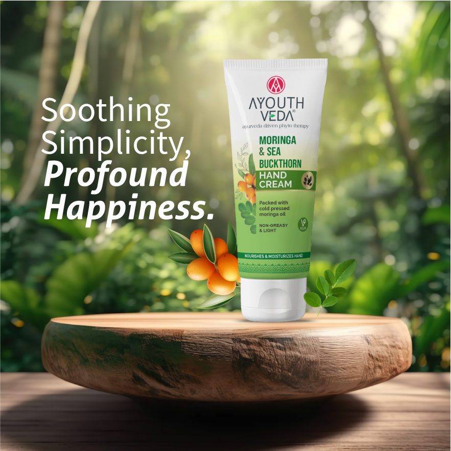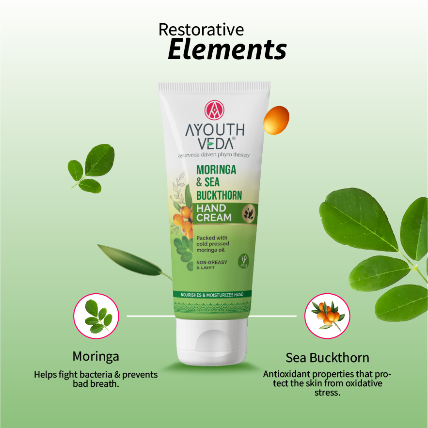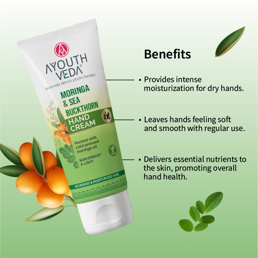 AYOUTHVEDA Moringa & Sea Buckthorn Hand Cream harnesses the revitalizing benefits of Moringa and Sea Buckthorn to deeply nourish and rejuvenate your hands. Experience intense hydration infused with natural oils and extracts for supple, radiant skin.