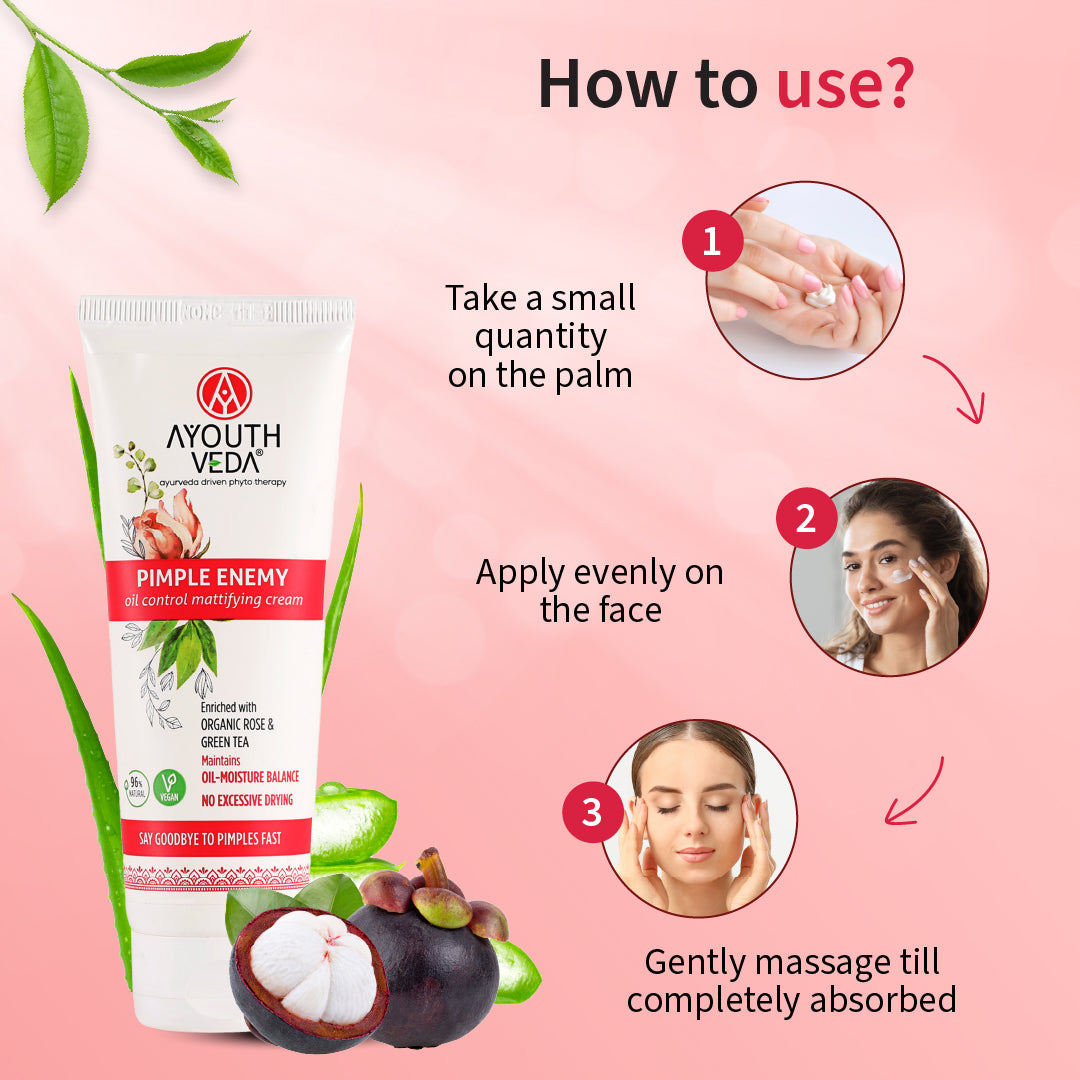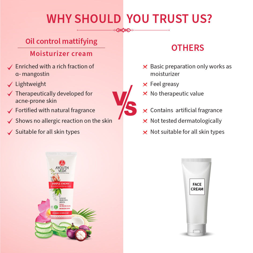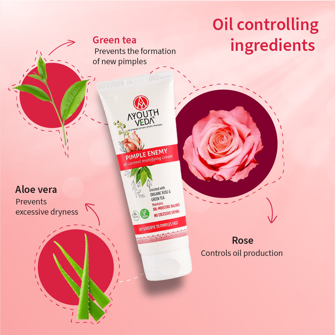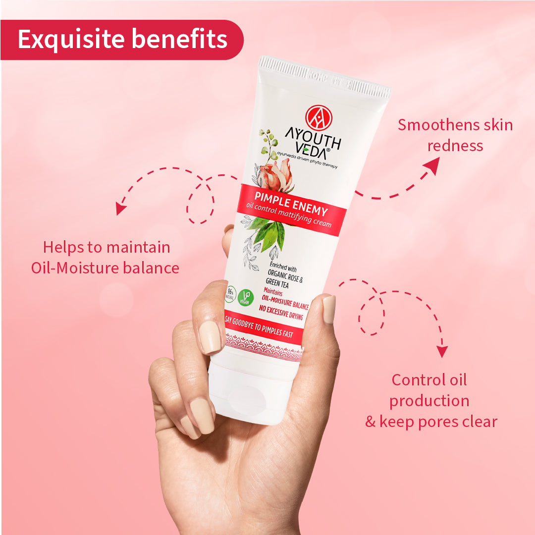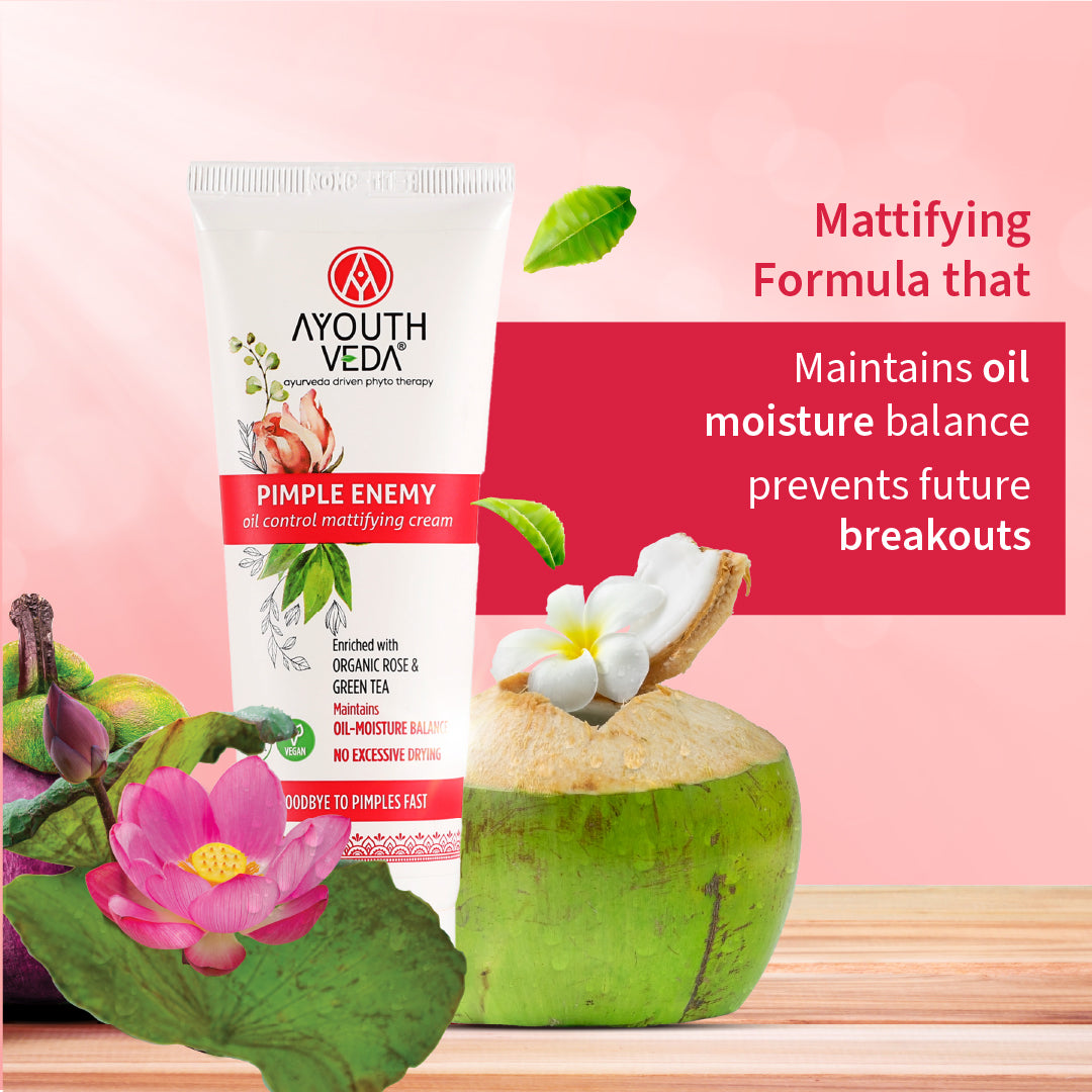 AYOUTHVEDA Oil Control Mattifying Cream offers a fast-absorbing matte formula that effectively regulates oil production while providing nourishment to the skin.