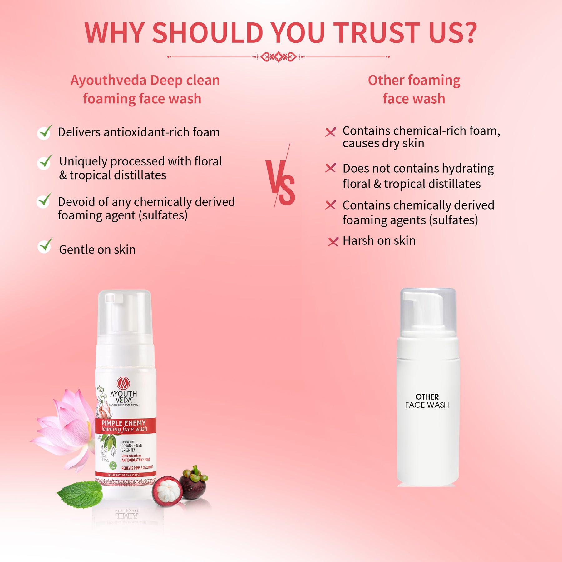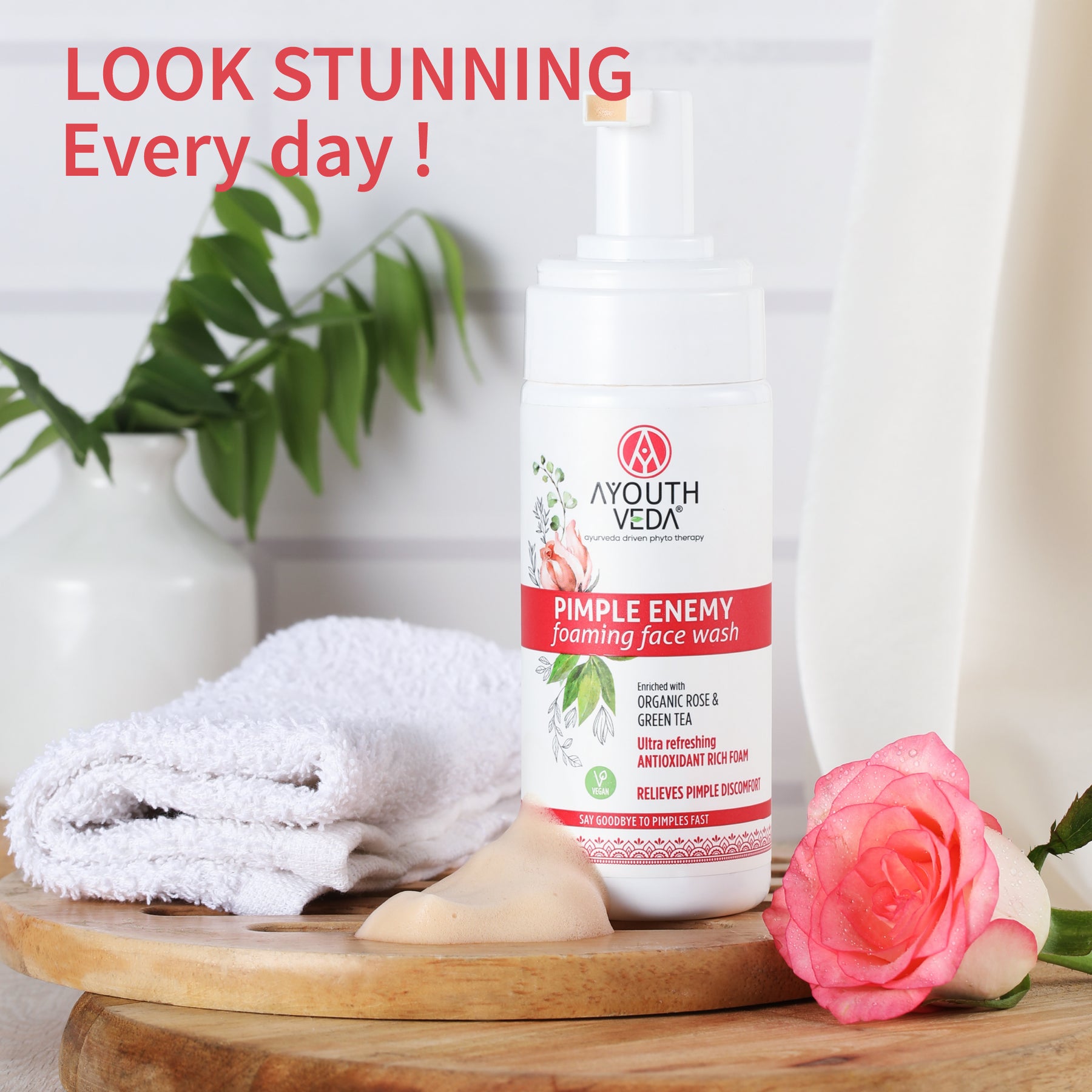 AYOUTHVEDA Pimple Enemy Foaming Facewash features a powerful Alpha-CURe Complex that effectively targets pimple-causing bacteria, reduces redness, and soothes irritation. Experience skin that feels soft, rejuvenated, and refreshed after each use.
